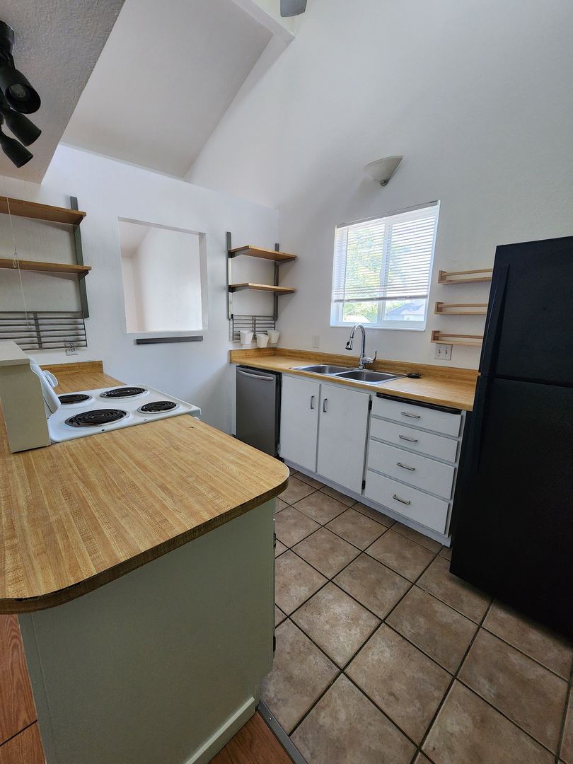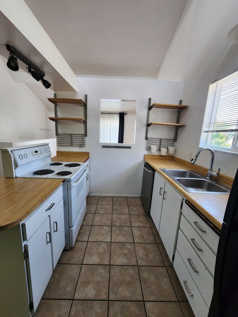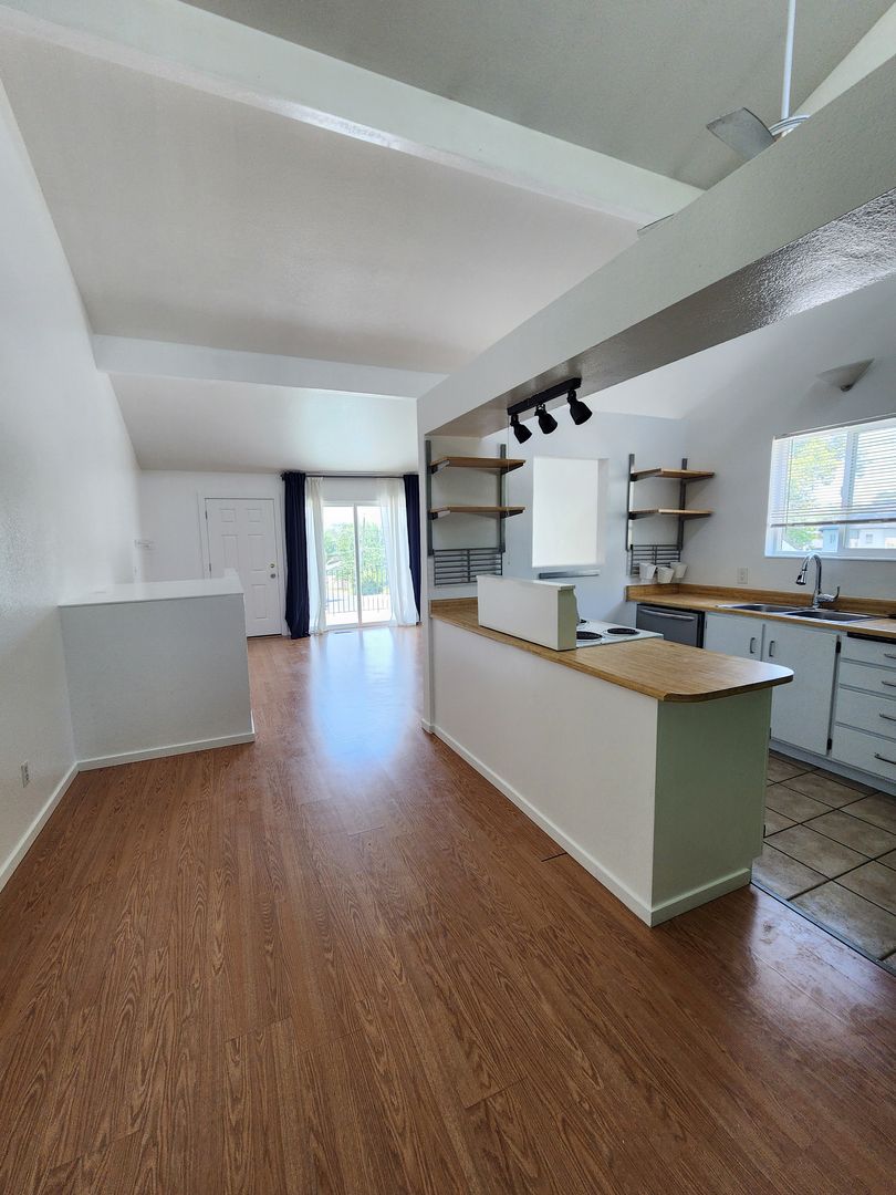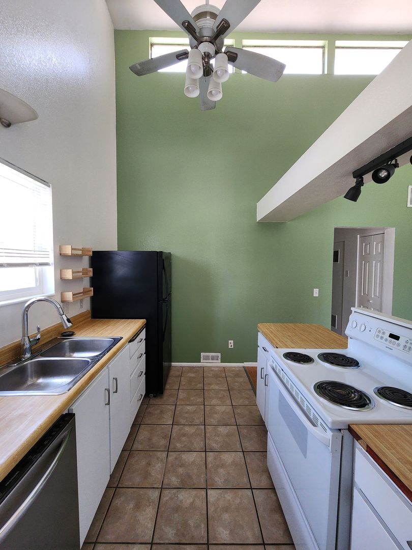 Updated 3 bedroom 2 bathroom 2-floor townhome END UNIT in small four-plex townhome community. Located on a convenient but quiet street. This unit features tall vaulted ceilings and skylights, a front balcony, and a back patio. The interior has been finished with fresh paint and updated flooring. The kitchen includes a disposal, stove, dishwasher, and a new fridge! This unit has plenty of extra storage, an attached garage, washer dryer hookups tucked into a closet, and amazing details and finishes.