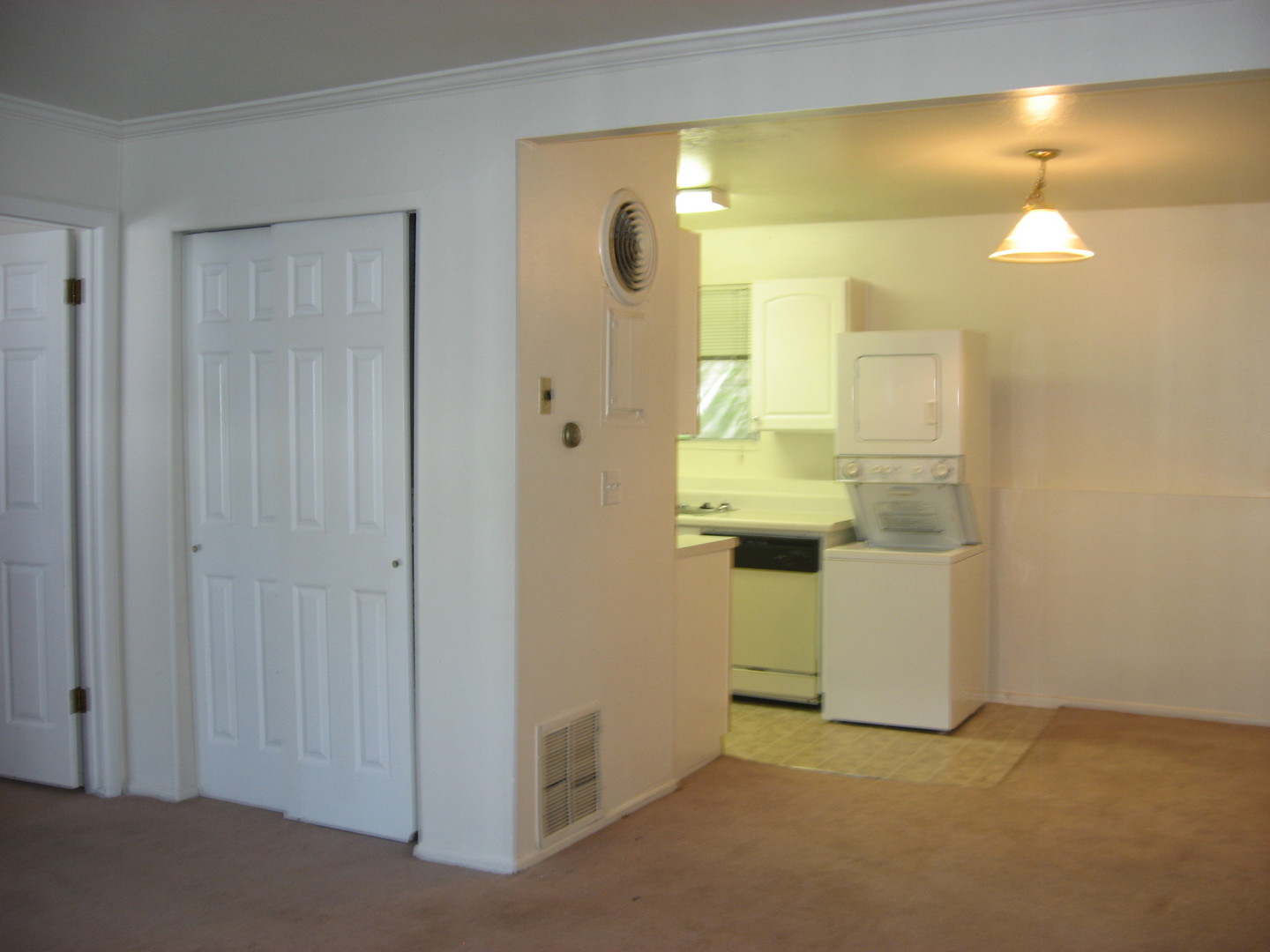 This is an ENORMOUS 1 bedroom 1 bath with a perfect spacious layout. It is located on the top floor of a two and half story 12 unit building, in the small and friendly Forest Park Apartment community. Included inside is a dishwasher, disposal, double sink, electric stove with range, semi-formal dining, swamp cooler, a huge walk in closet, stackable washer dryer, a big bathroom, a private patio with an extra storage closet and tons of charm! DOGS OK! Other amenities include a community pool, and covered parking!